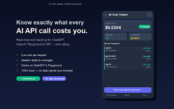 AI Cost Viewer is een gratis Chrome-extensie die real-time kosten voor AI API-aanroepen bijhoudt. Deze tool biedt gebruikers directe toegang tot de kosten per aanvraag voor populaire modellen zoals OpenAI, Anthropic Claude en Google Gemini. Het toont de exacte dollarbedragen van elke aanvraag zonder dat er vertraging of verversing nodig is, waardoor gebruikers een helder overzicht krijgen van hun uitgaven. Met een gebruiksvriendelijke interface die automatisch werkt, kunnen ontwikkelaars, productmanagers en onderzoekers hun kosten effectief beheren.